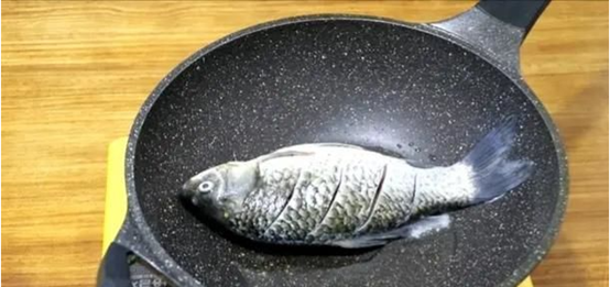 1、鯽魚洗凈, 去除肚、 腸、 鰓, 魚身兩面劃網(wǎng)格狀花刀。