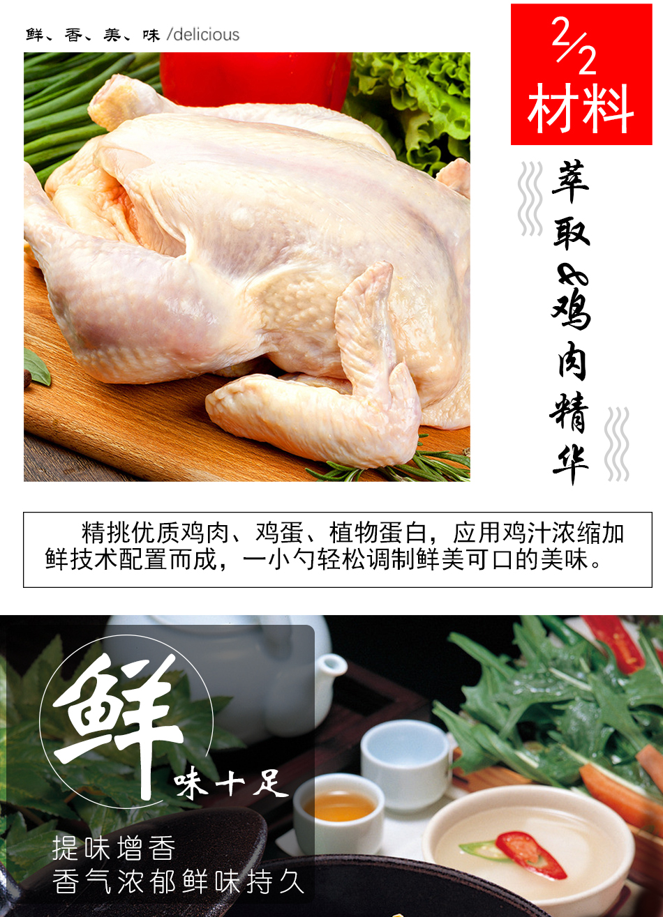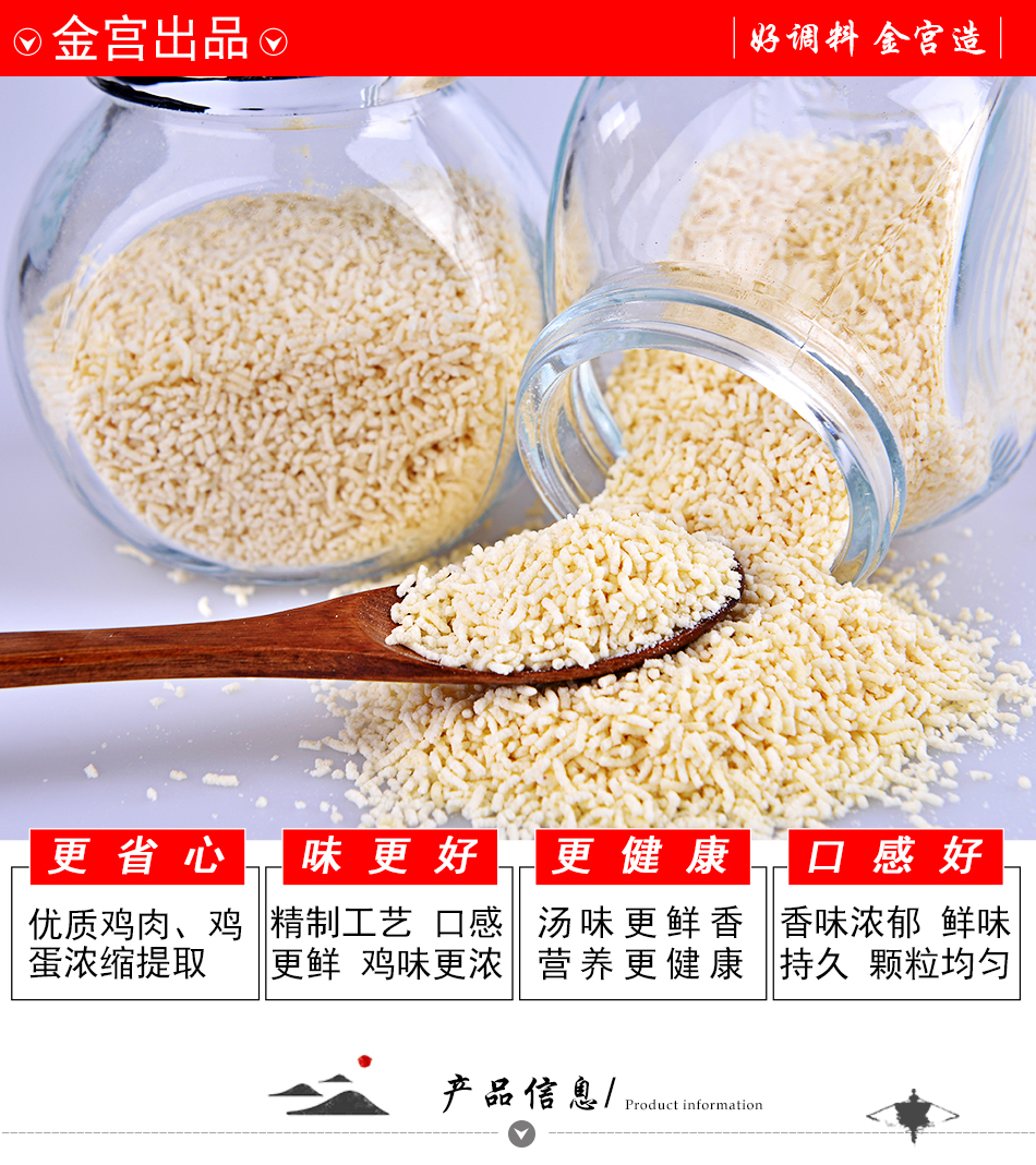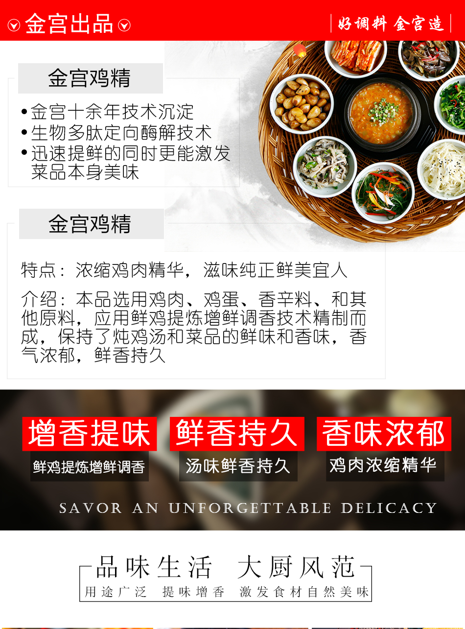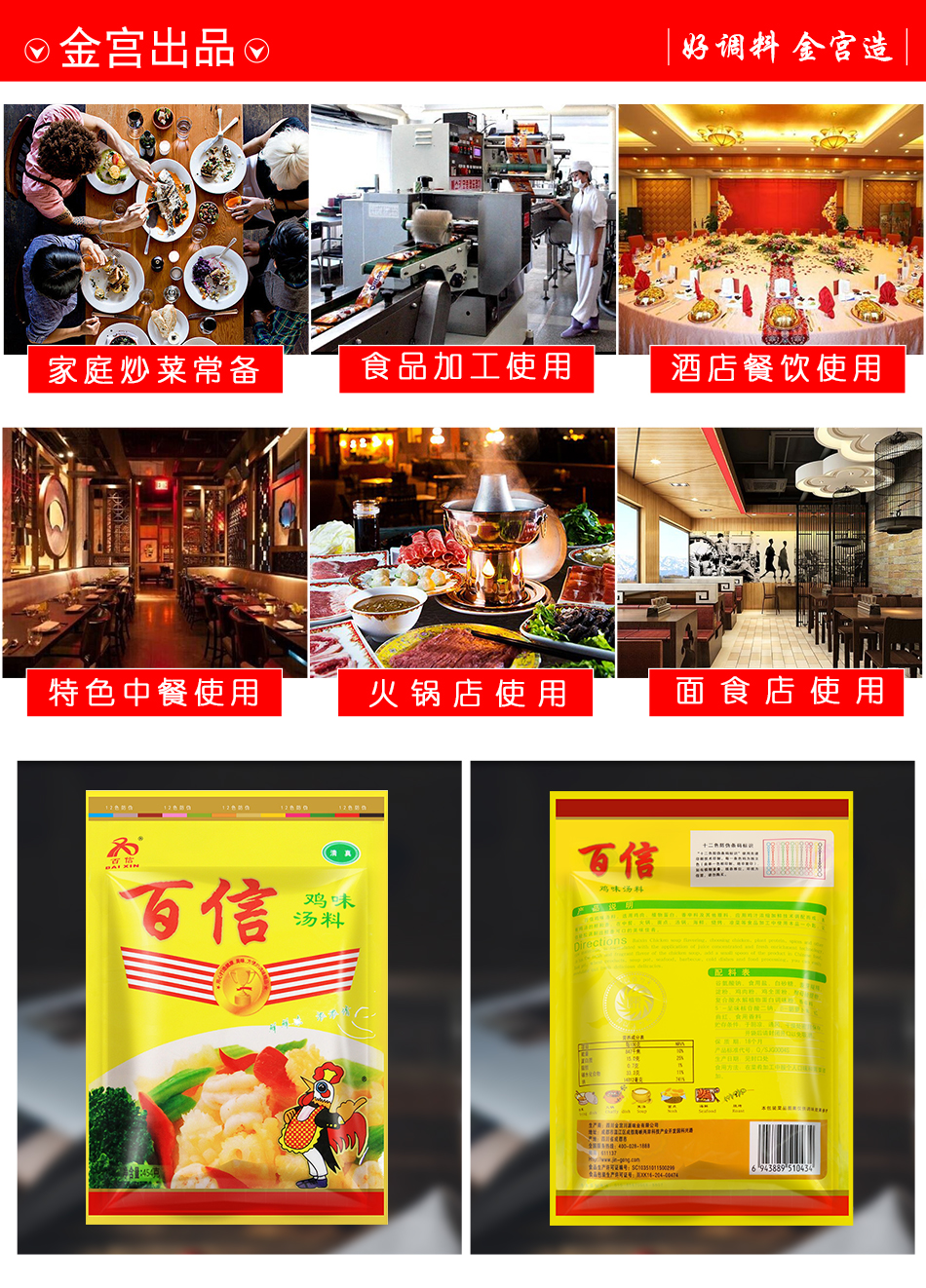 產(chǎn)品簡介:本品經(jīng)金宮資深調(diào)味師多年科學(xué)調(diào)配,研制出雞汁特鮮的湯料,在菜肴、火鍋、湯類、點(diǎn)心及食品加工中適量加入,可迅速提升菜品鮮度。