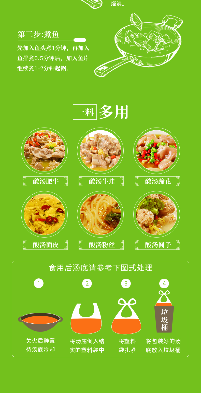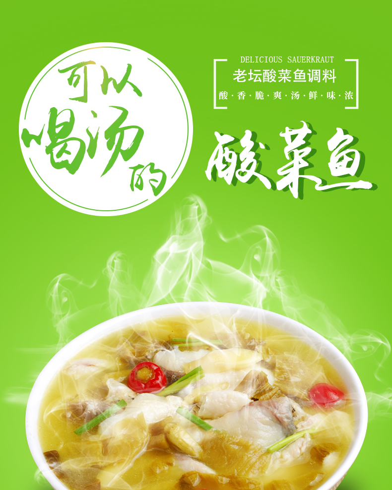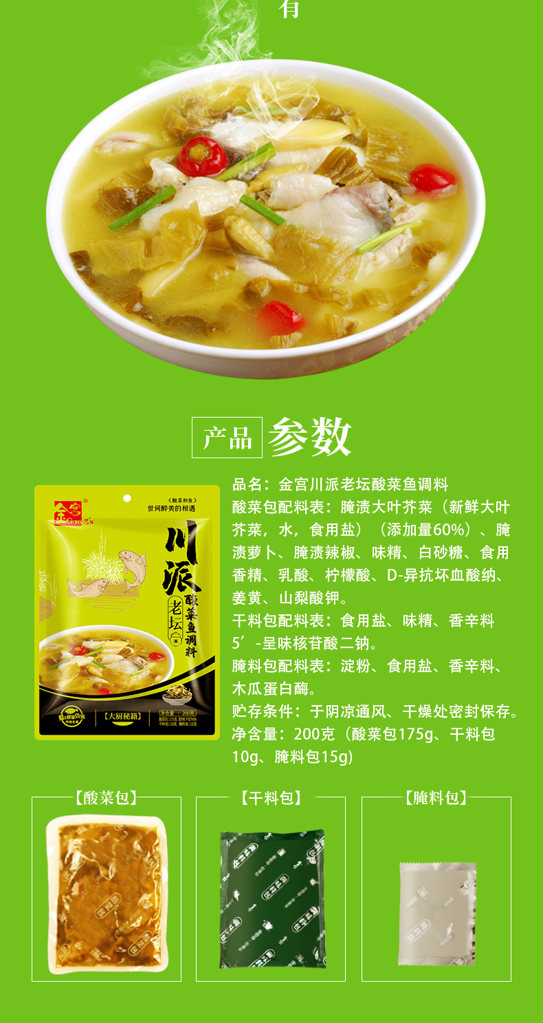 產(chǎn)品簡介:本調(diào)料由金宮川派公司川菜研發(fā)團(tuán)隊(duì)收集川、渝漁翁煮魚的方法,精選四川腌漬大葉芥菜、腌漬蘿卜.腌漬辣椒、腌漬姜等為原料,采用傳統(tǒng)發(fā)酵和現(xiàn)代食品加工新技術(shù),經(jīng)過精心加工而成。酸菜青綠,湯色微黃;酸香沁脾、誘人食欲;充分體現(xiàn)了川派酸菜魚酸香爽脆、湯濃醇鮮、魚肉細(xì)嫩的風(fēng)味特色。
