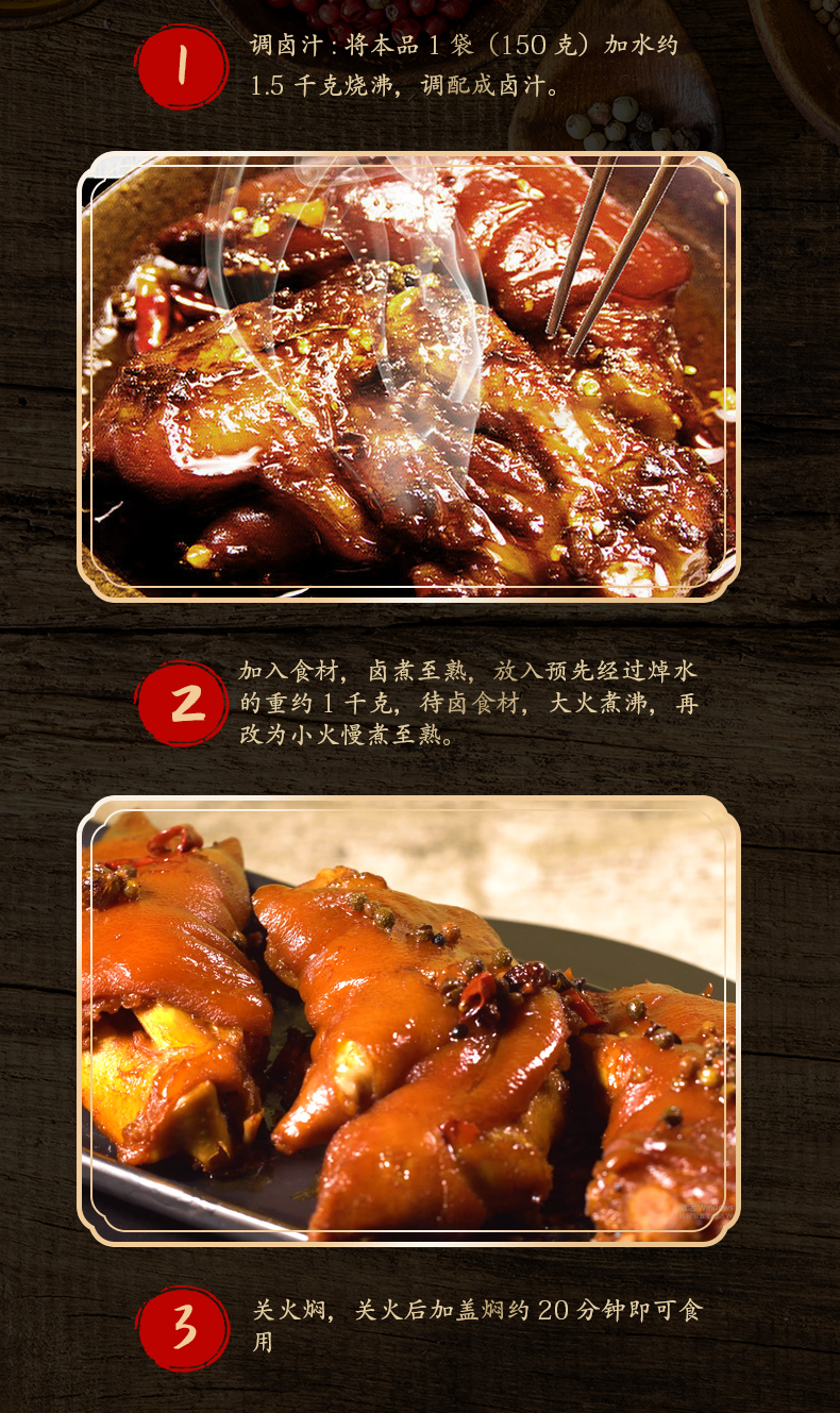 產(chǎn)品簡介:金宮川派香辣鹵料精選20多種香辛料熬制、調(diào)味而成,用于調(diào)制鹵水。食材在鹵水中鹵熟后,鹵香濃郁、香中帶辣,聞之垂涎欲滴,食之滿口生香、欲罷不能。一袋金宮調(diào)料在手,鹵味輕松擁有!