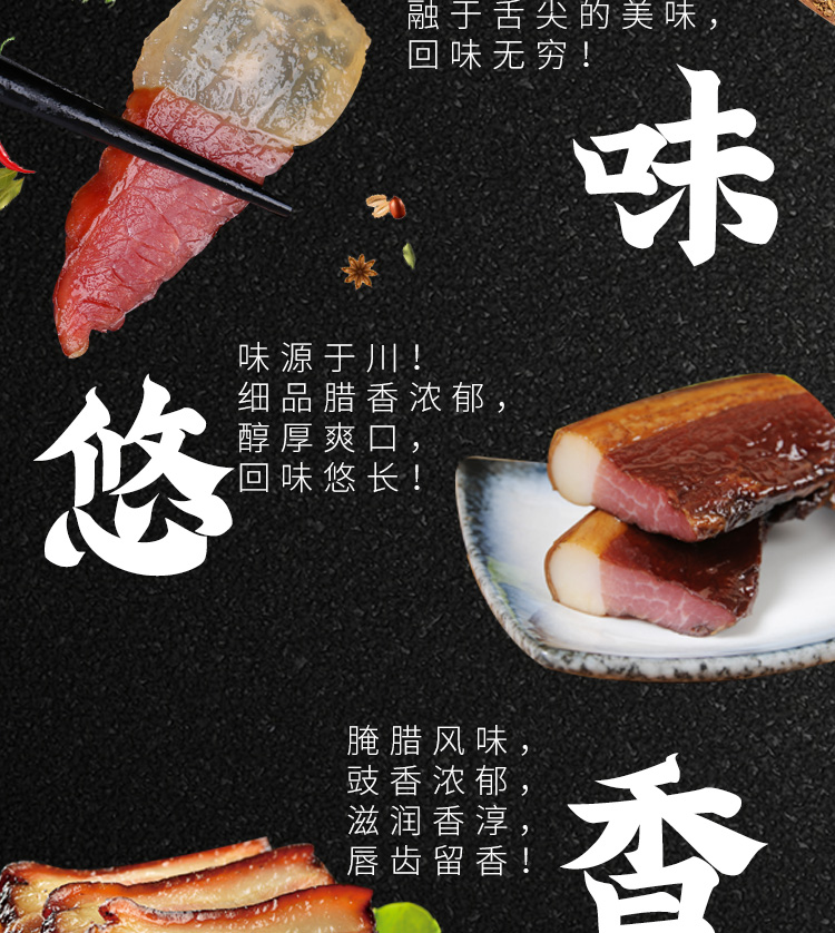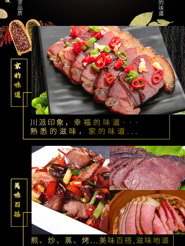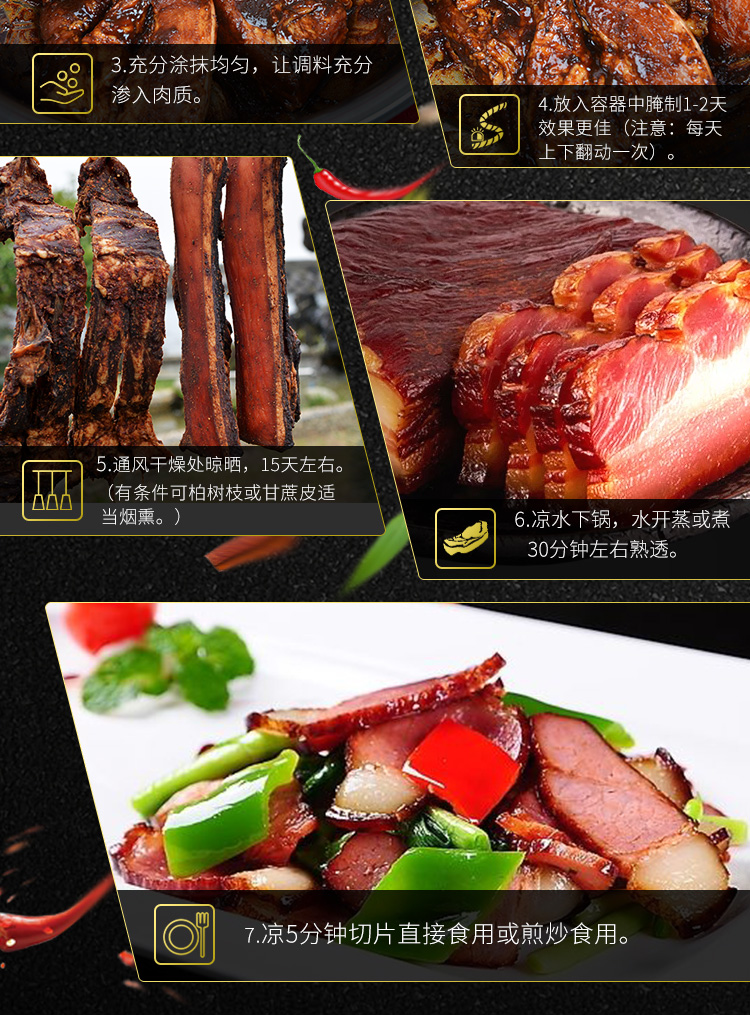 產(chǎn)品簡介:本品精選多種四川本地優(yōu)質原料,制作的老臘肉充分體現(xiàn)了腌臘和豉香風味、不經(jīng)煙熏而熏香濃郁、回味悠長的特點,是家庭、食堂、餐廳制作四川老臘肉的上乘調料。
