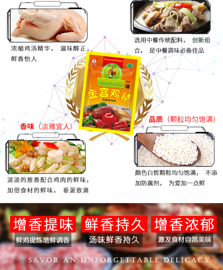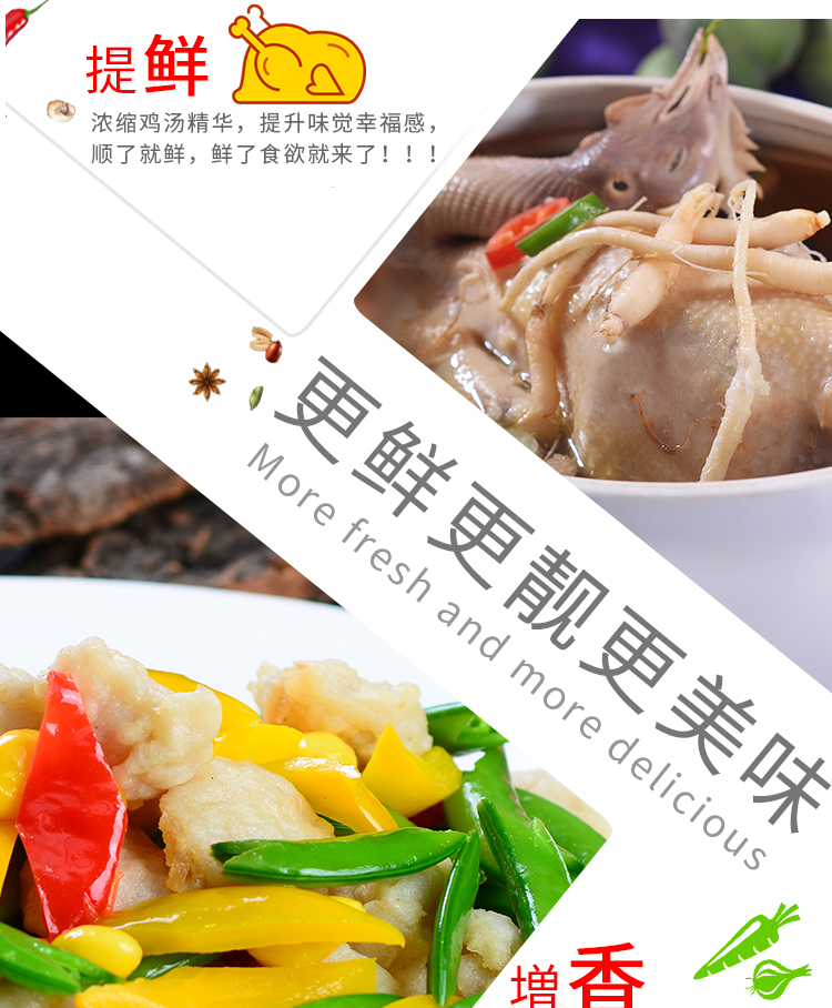 產(chǎn)品簡(jiǎn)介:本品采用高科技和新工藝精致而成,具有上等雞湯的精華,味道鮮美、香氣濃郁,是家庭、酒樓、餐飲、火鍋、點(diǎn)心及食品加工的調(diào)味佳品。