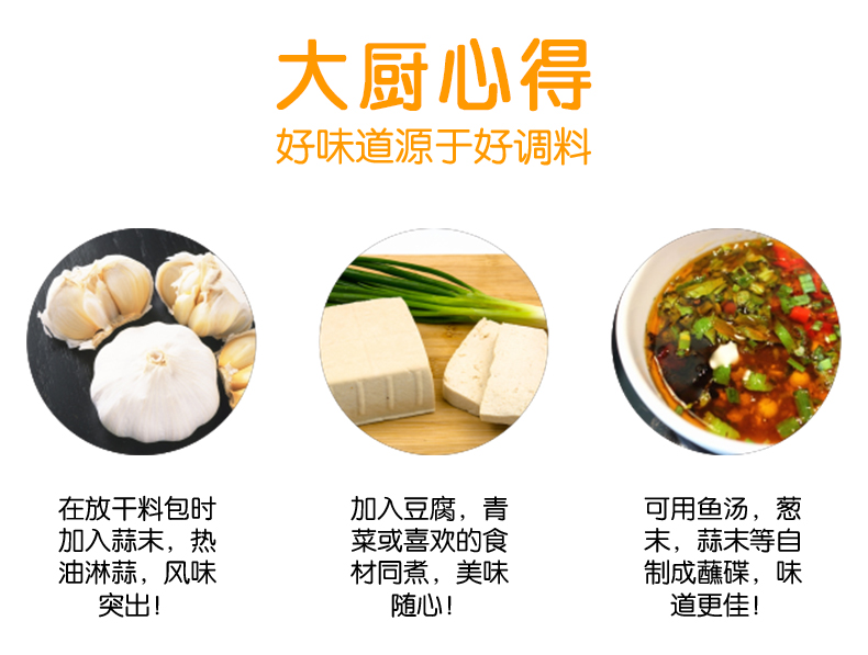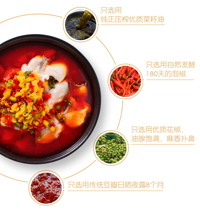 產(chǎn)品簡(jiǎn)介:本調(diào)料是金宮川派公司川菜研發(fā)團(tuán)隊(duì)收集川、渝江河上漁翁煮魚的方法,挑選泡椒(即:腌漬辣椒)、腌漬生姜、腌漬大蒜、郫縣豆瓣、花椒等精心牖炒爆香而成,烹調(diào)出來的魚肉,酸香濃郁,質(zhì)感鮮嫩細(xì)滑,既去除了魚的腥味,又保持了魚的鮮嫩,辣而不燥,辣中見麻。