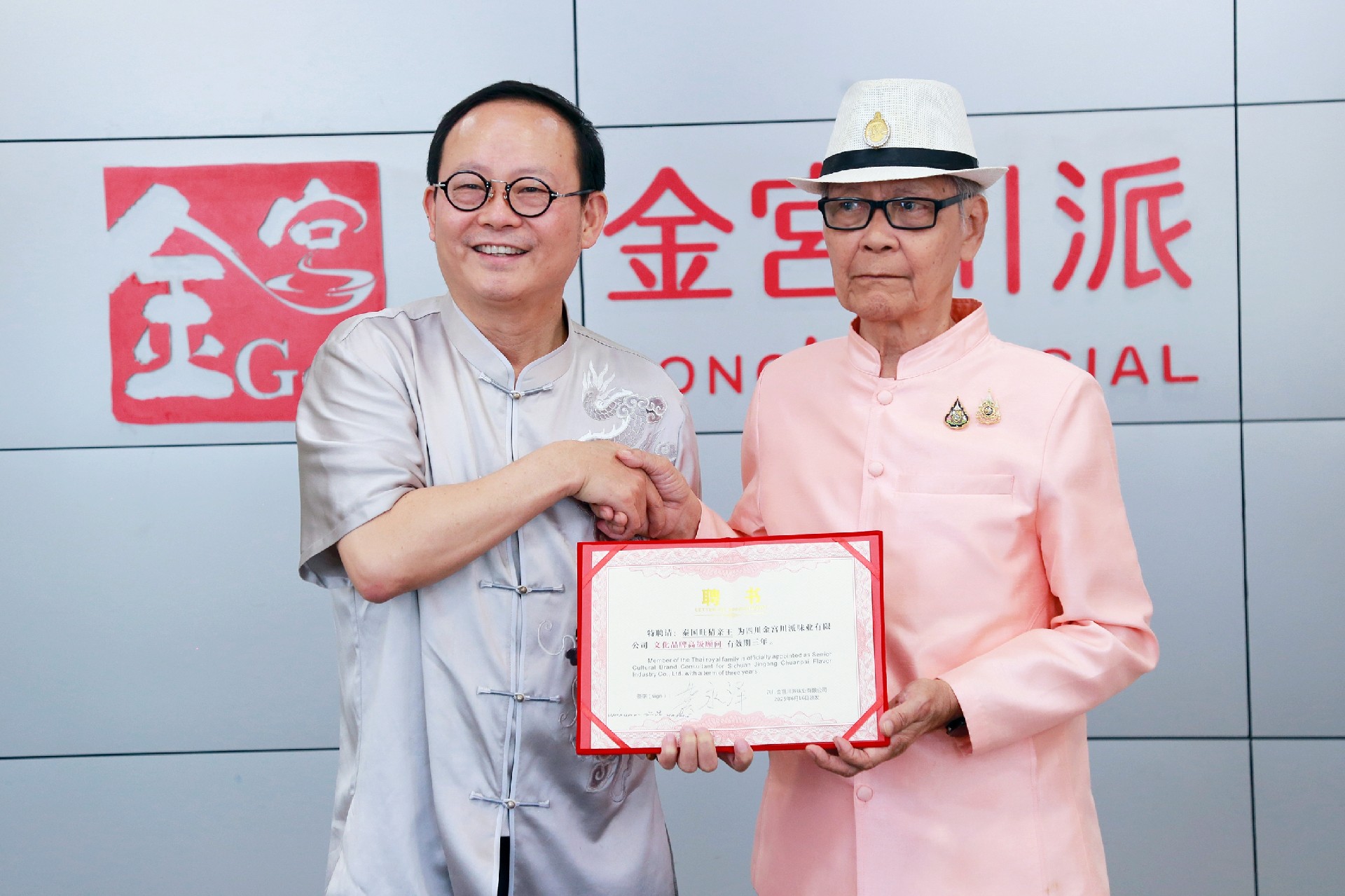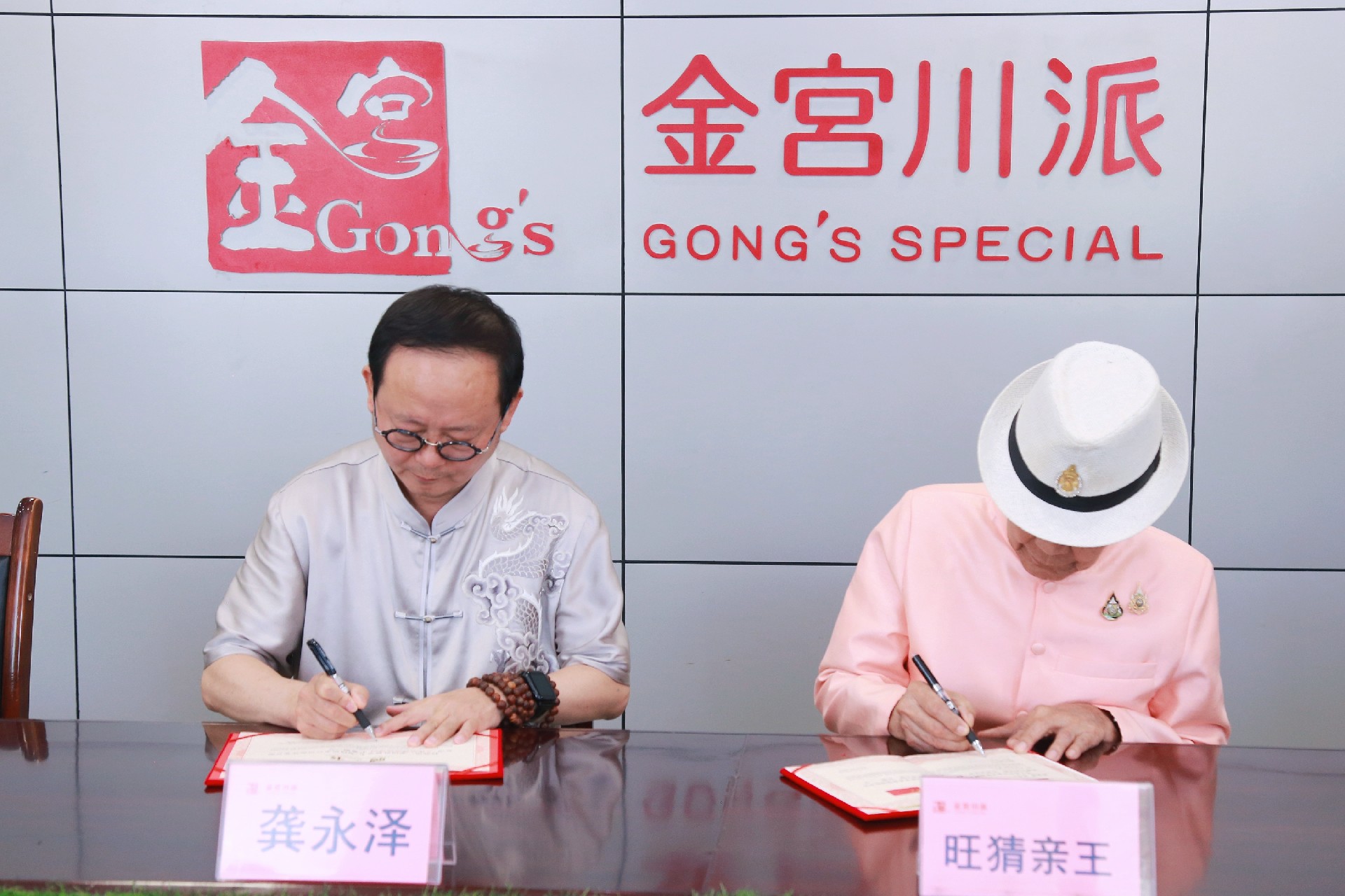同時,會上簽署了聘書和榮譽證書。龔永澤董事長被特聘為泰國旺猜親王的川派美食顧問,并被特授予中泰美食文化大使稱號。金宮品牌被授予"泰國親王調(diào)味品御用品牌",川派、百信品牌被授予"泰國親王指定調(diào)味品合作品牌",金宮川派集團旗下多個品牌同時被授予泰國親王指定合作品牌;金宮川派集團特聘請?zhí)﹪掠H王為公司文化品牌高級顧問。