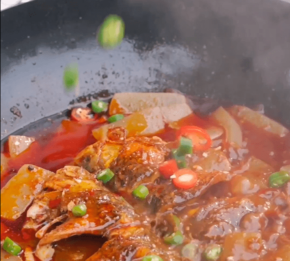 倒油加熱,放入金宮川派烤魚調(diào)料翻炒出香味,加水燒開。并加入炸好的鯽魚或黔魚以及準(zhǔn)備好的配菜;