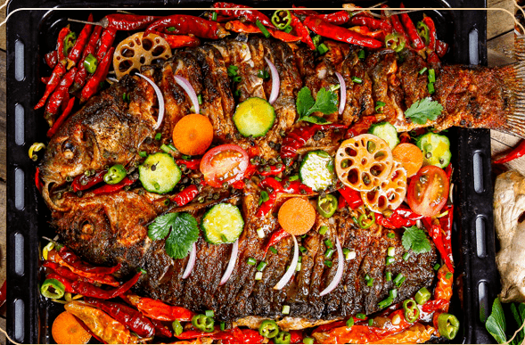 這樣魚算是烤好了,烤好之后接下來就是制作料理啦。料理其實(shí)很簡(jiǎn)單,準(zhǔn)備好金宮川派烤魚調(diào)料、新鮮鯽魚或黔魚,青紅椒、大蔥、你喜歡的配菜。