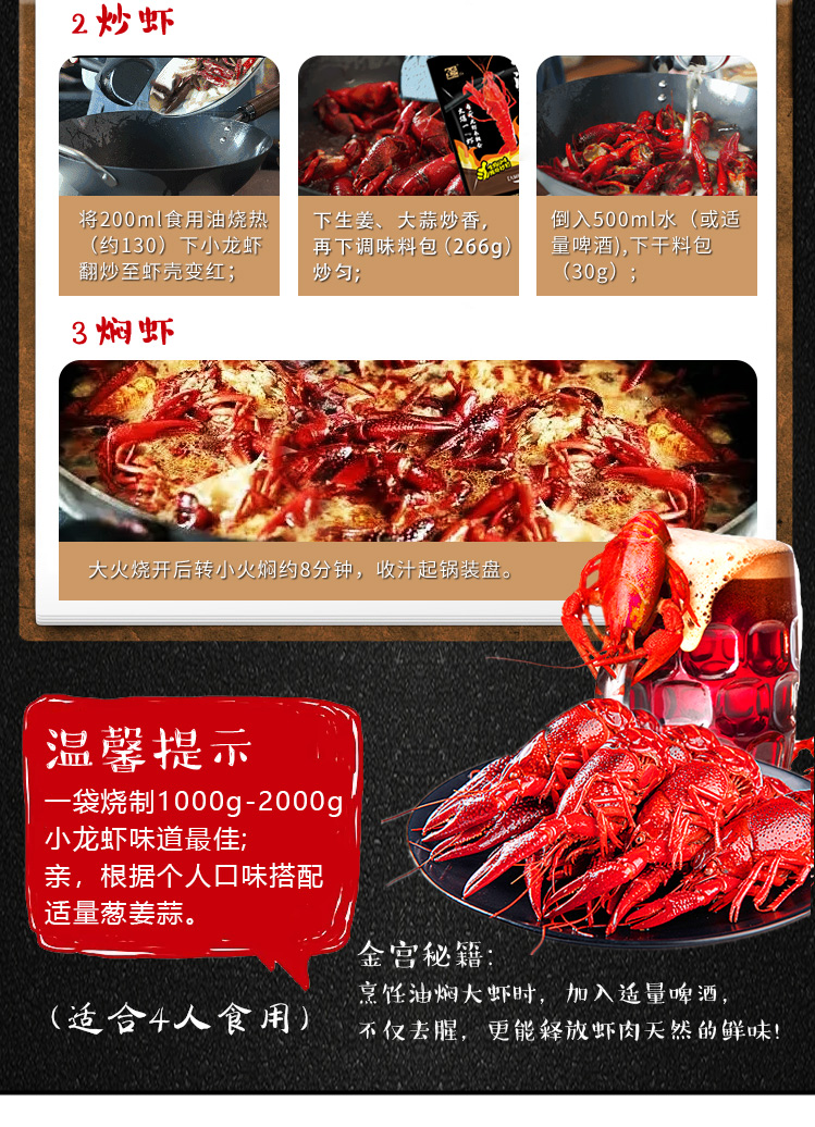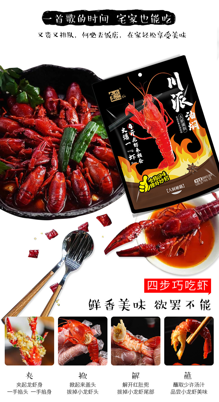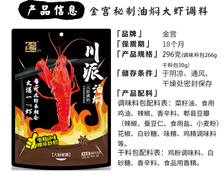 產(chǎn)品簡介:本調(diào)料是金宮川派公司川菜研發(fā)團(tuán)隊(duì)收集川、渝江河上漁翁炒蝦的方法,精選新鮮大蒜、洋蔥、香辛料等煽炒爆香精心制作而成,烹調(diào)出來的小龍蝦外殼紅亮、蝦肉細(xì)嫩、辣中有麻,回味有日。