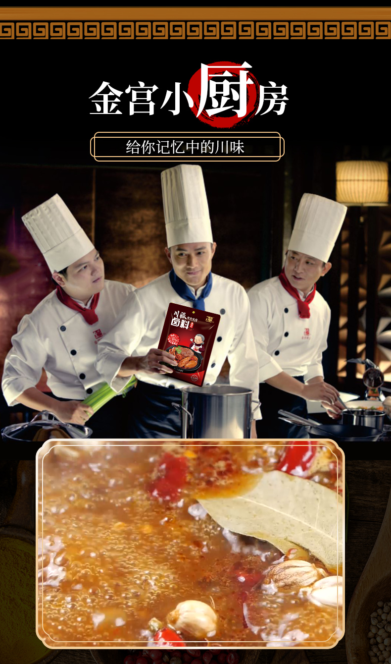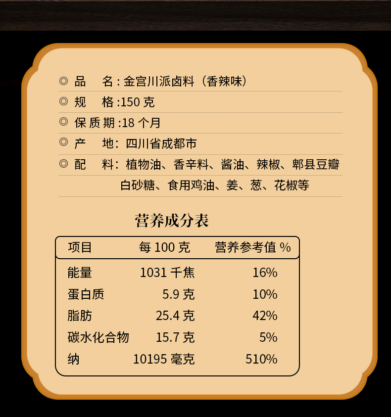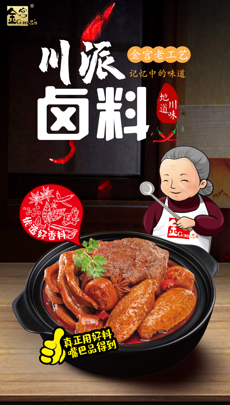 產(chǎn)品簡介:金宮川派香辣鹵料精選20多種香辛料熬制、調(diào)味而成,用于調(diào)制鹵水。食材在鹵水中鹵熟后,鹵香濃郁、香中帶辣,聞之垂涎欲滴,食之滿口生香、欲罷不能。一袋金宮調(diào)料在手,鹵味輕松擁有!