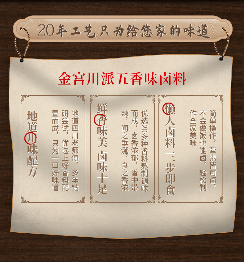 產(chǎn)品簡介:金宮川派五香鹵料精選20多種香辛料熬制、調(diào)味而成,用于調(diào)制鹵水。食材在鹵水中鹵熟后,芳香濃郁、鹵味十足,聞之垂涎欲滴,食之滿口生香。一袋金宮調(diào)料在手,鹵味輕松擁有!