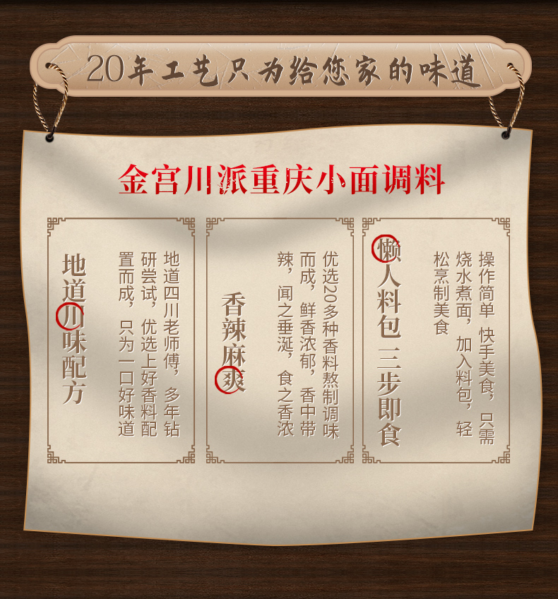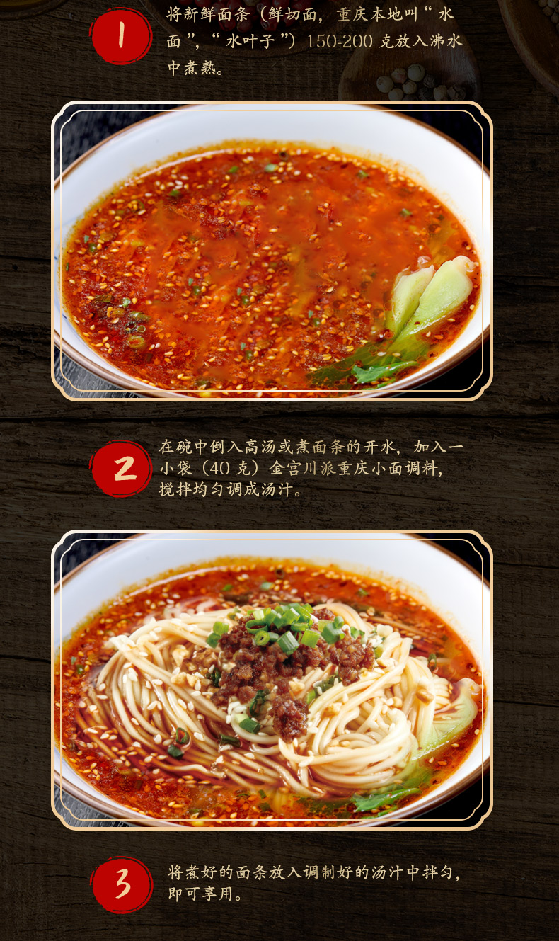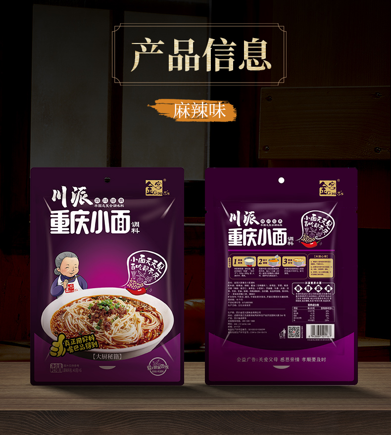 產品簡介:金宮川派重慶小面調料,由金宮川派公司研發(fā)團隊在收集傳統(tǒng)重慶面食制作方法的基礎上,采用現(xiàn)代食品加工技術,創(chuàng)新研制。做出來的面條色澤紅亮、香辣麻爽,細品慢嚼,其湯汁鮮香撲鼻、味道濃厚。