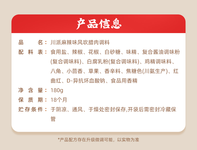 產(chǎn)品簡介:金宮川派風吹臘肉調(diào)料精選上等香辛料,每一味都經(jīng)過精心挑選,確保品質(zhì)上乘??茖W配比,既保留了傳統(tǒng)風味,又加入了現(xiàn)代人對健康飲食的需求。