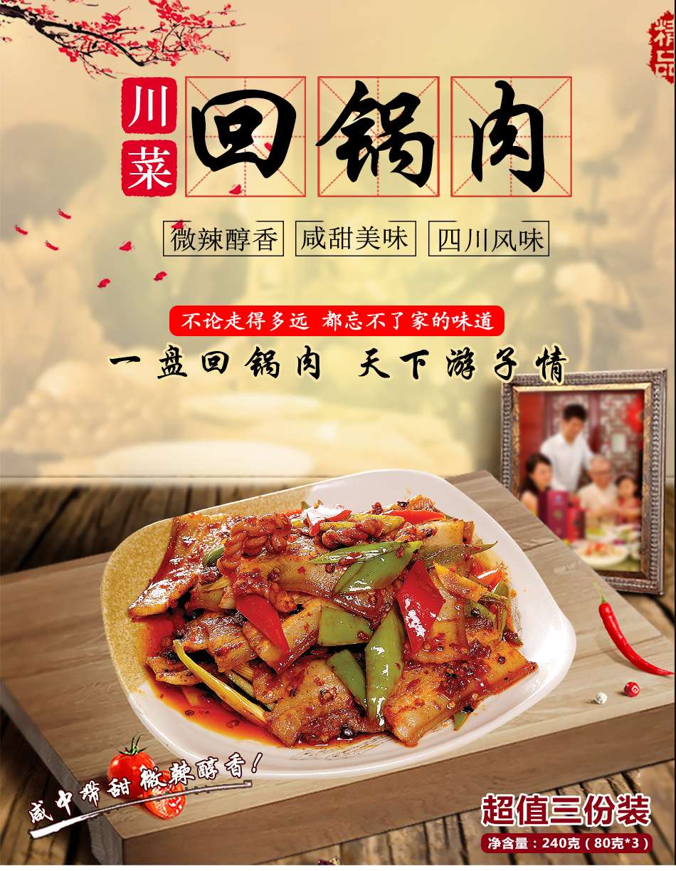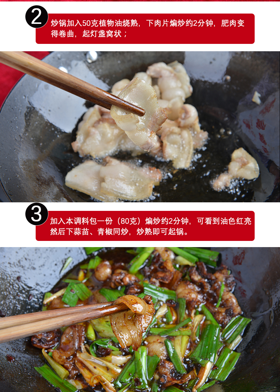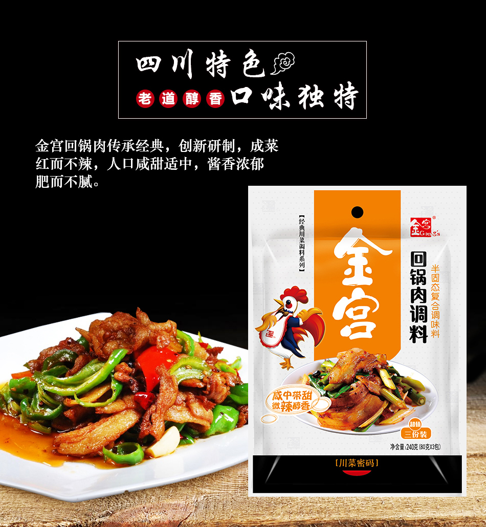 產(chǎn)品簡(jiǎn)介:四川名菜—回鍋肉,古時(shí)即稱"油爆鍋”,成型"燈盞窩”,號(hào)稱"川菜之首”。金宮回鍋肉調(diào)料傳承經(jīng)典,創(chuàng)新研制,成菜紅而不辣,入口咸中回甜,醬香濃郁,肥而不膩。輕松做好四川風(fēng)味回鍋肉,和家人朋友一起分享美味。