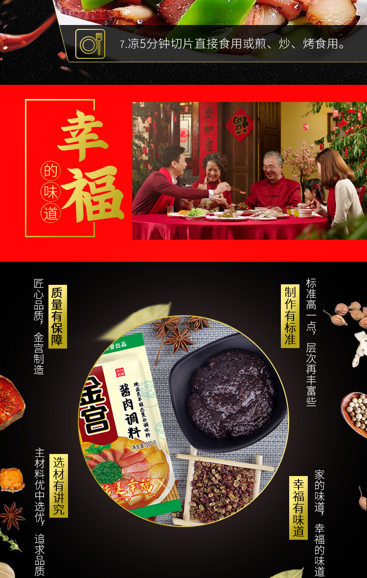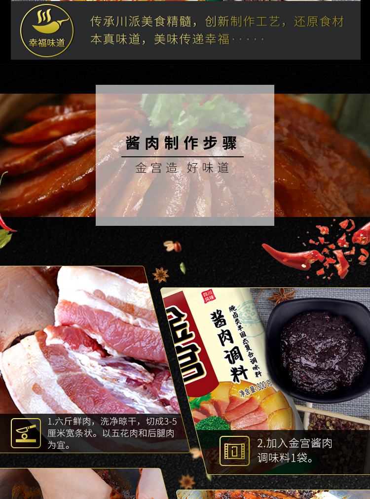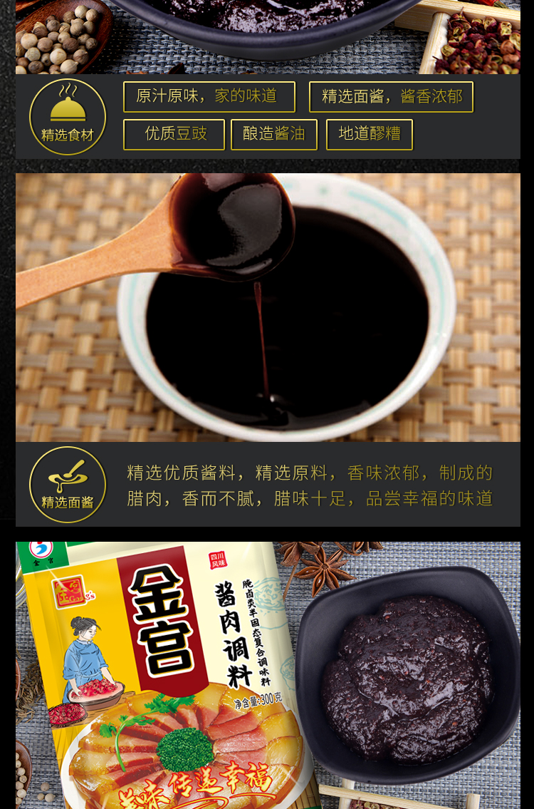 產(chǎn)品簡介:本品精選多種四川本地優(yōu)質(zhì)原料,用本調(diào)料制作的醬肉充分體現(xiàn)了醬香濃郁、肥而不膩、瘦而不柴、滋味鮮美的特點(diǎn),是家庭、食堂、餐廳制作四川醬肉的上乘調(diào)料。
