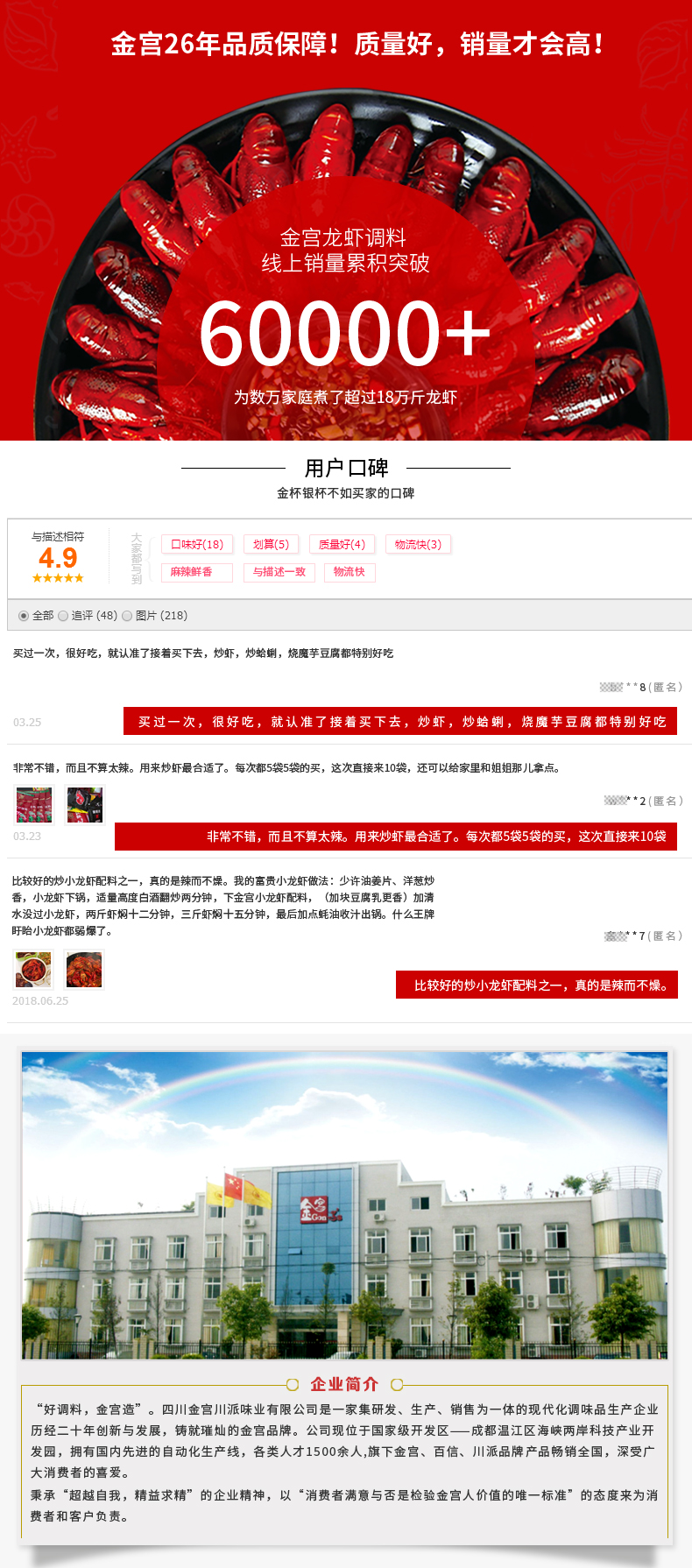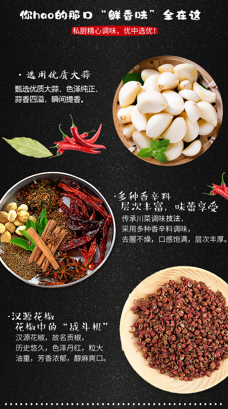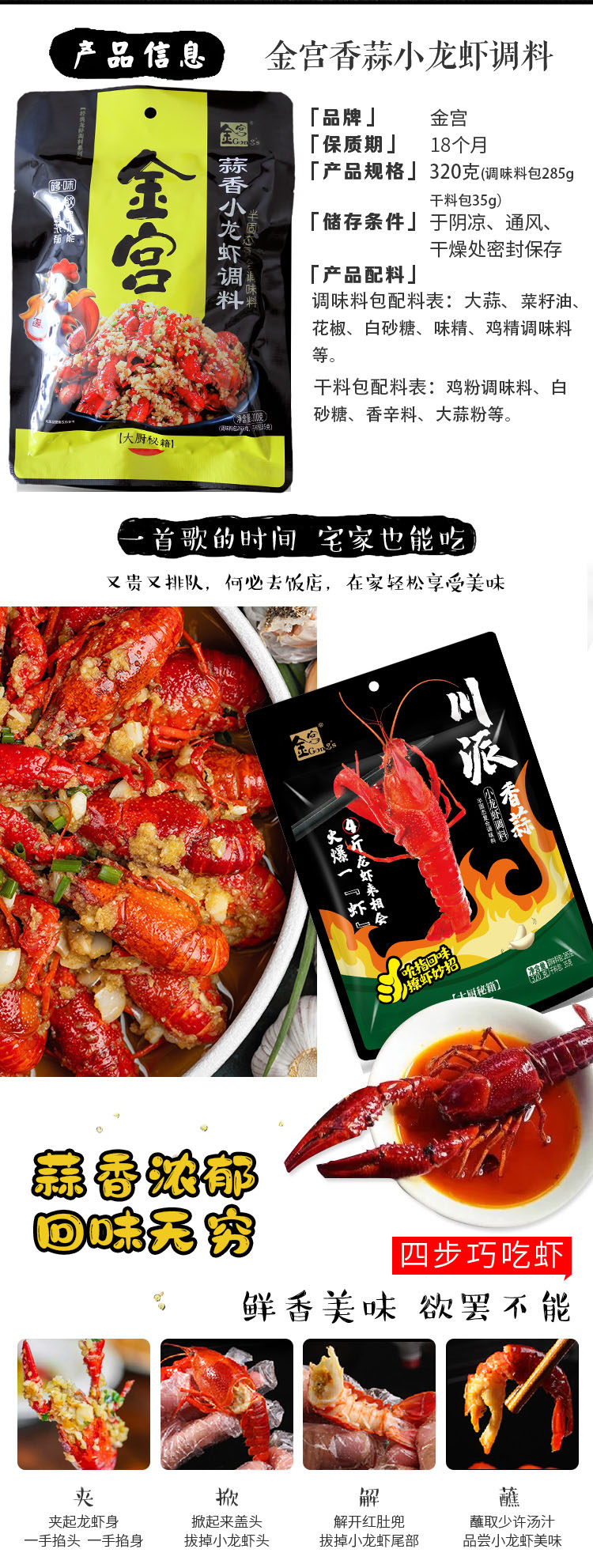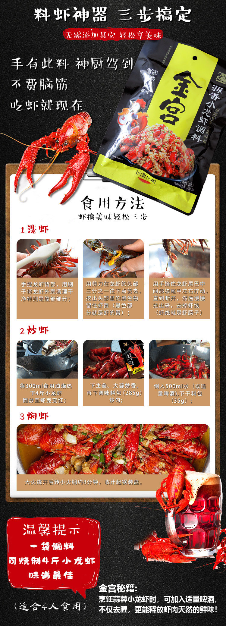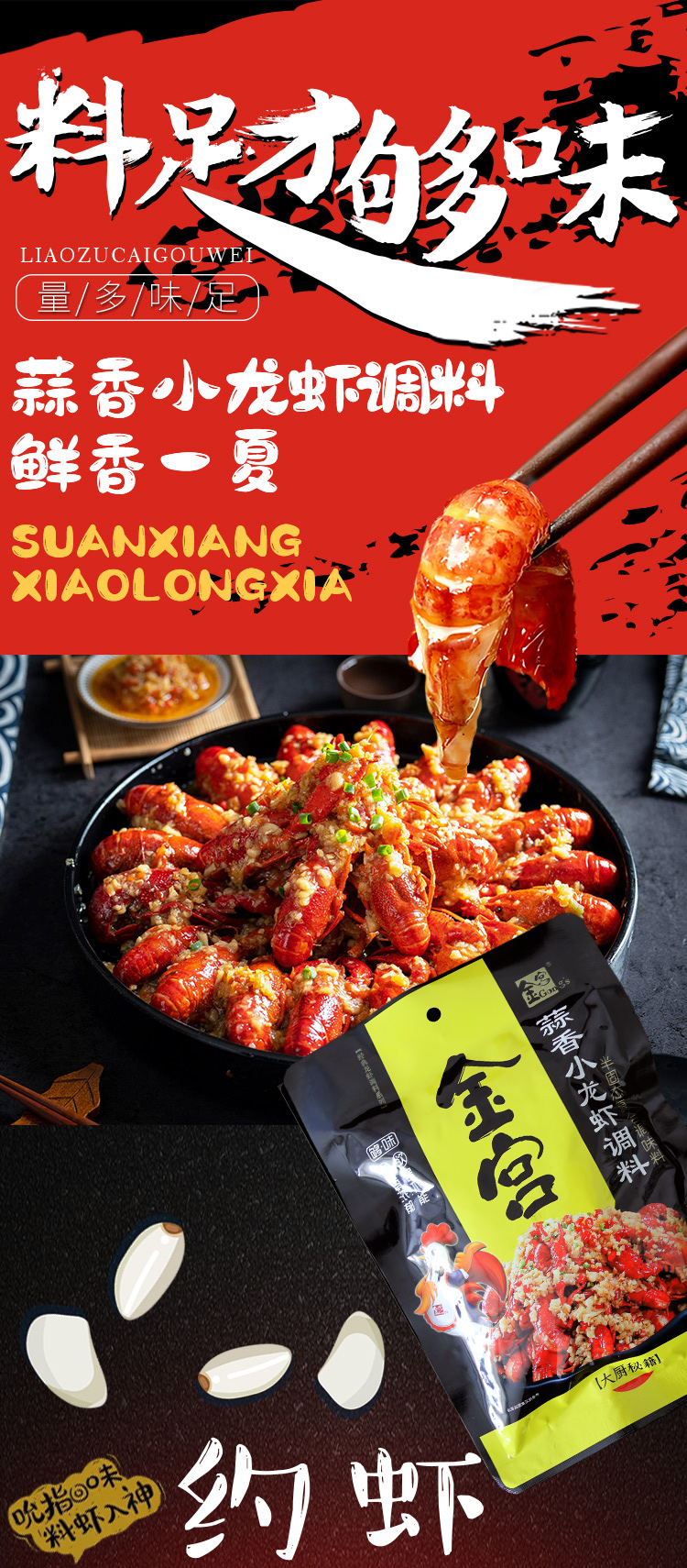 產(chǎn)品簡介:本調(diào)料是金宮川派公司川菜研發(fā)團(tuán)隊(duì)收集川、渝江河上漁翁炒蝦的方法,精選新鮮大蒜、洋蔥、香辛料等煽炒爆香精心制作而成,烹調(diào)出來的小龍蝦外殼紅亮、蝦肉細(xì)嫩、蒜香濃郁,食之欲罷不能。