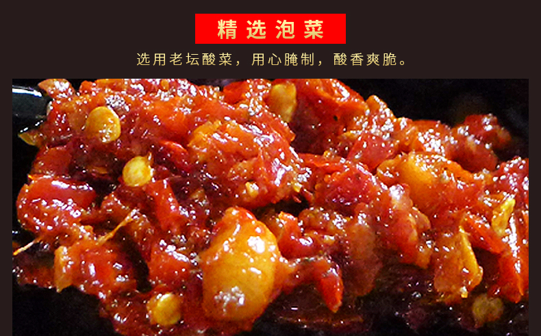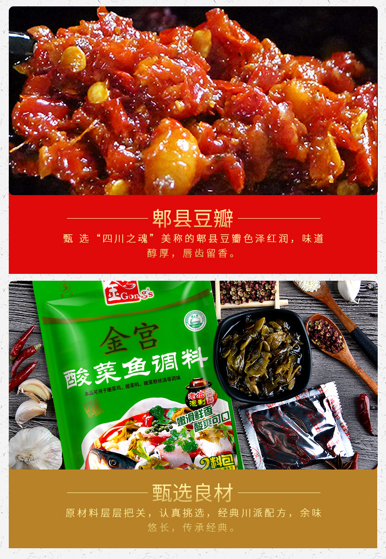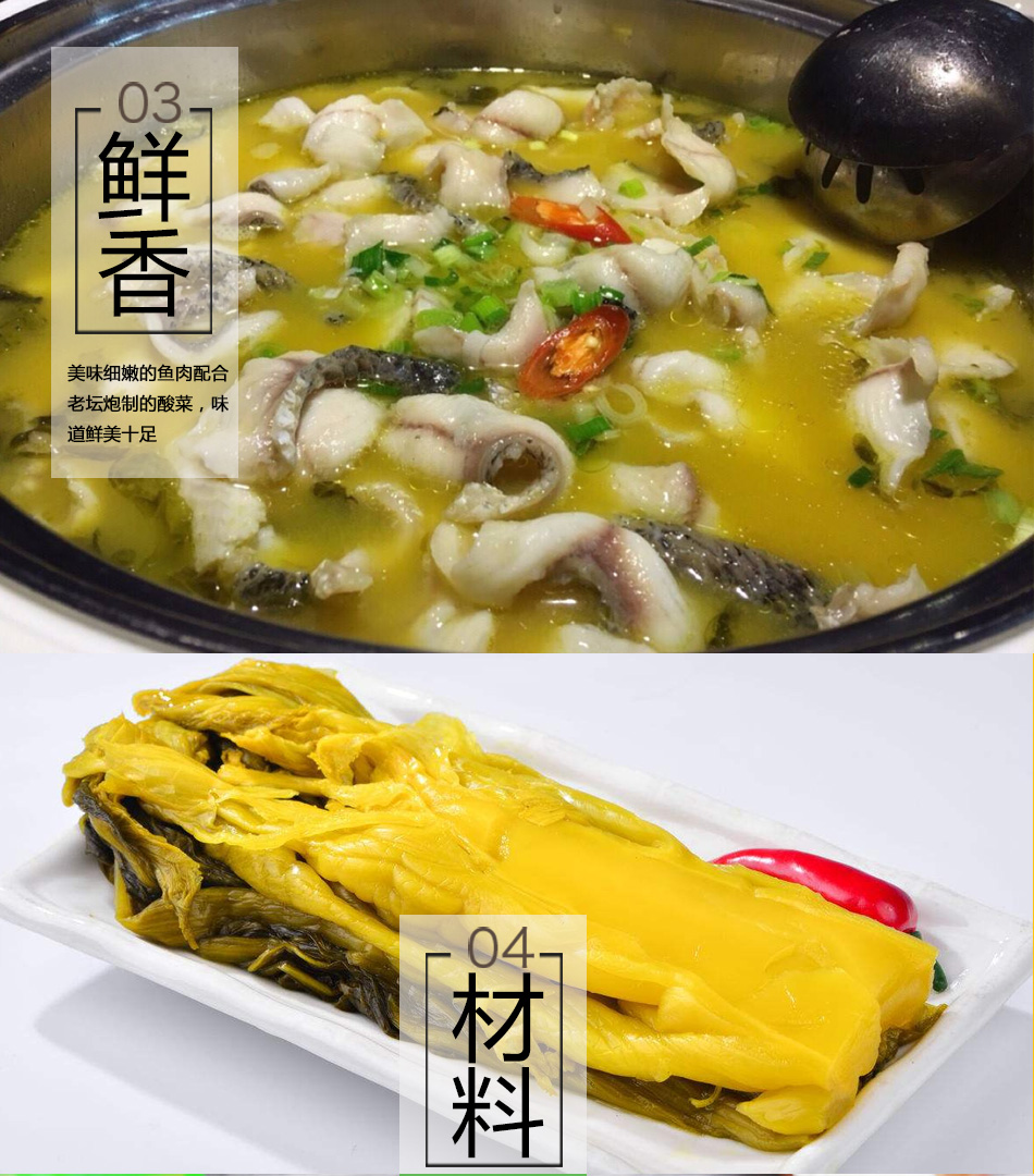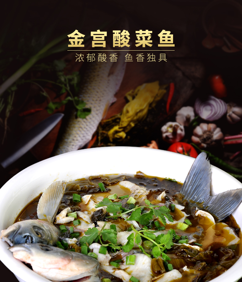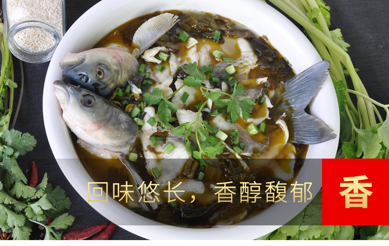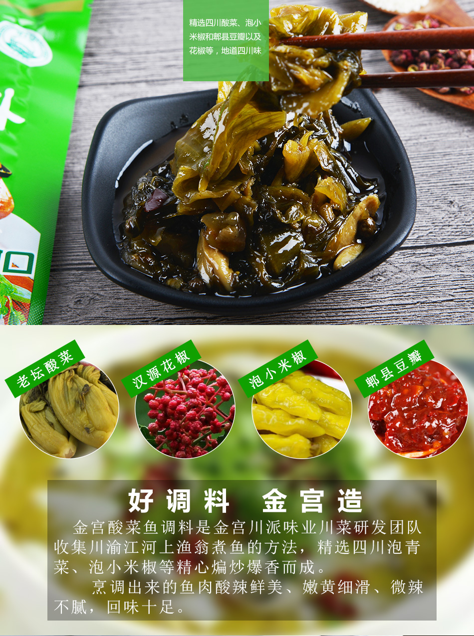 產(chǎn)品簡介:本產(chǎn)品憂選傳統(tǒng)老壇炮制的酸菜和小米辣,由金宮資深調(diào)味師精心調(diào)配,經(jīng)小火慢炒,讓酸、辣充分融合面獨樹一幟。食客在烹制過程中無需再次炒作,加適量清水下料煮魚至熟即成。