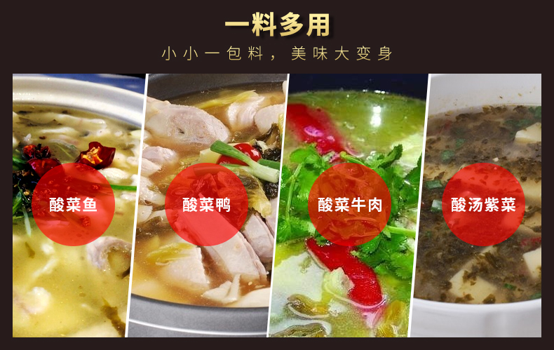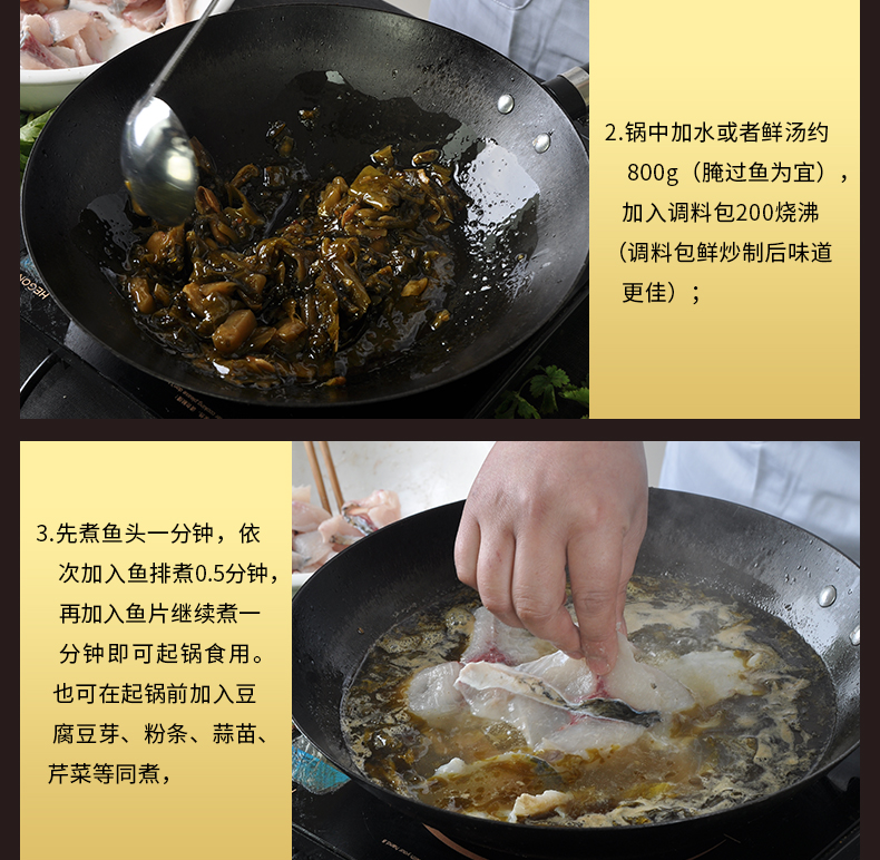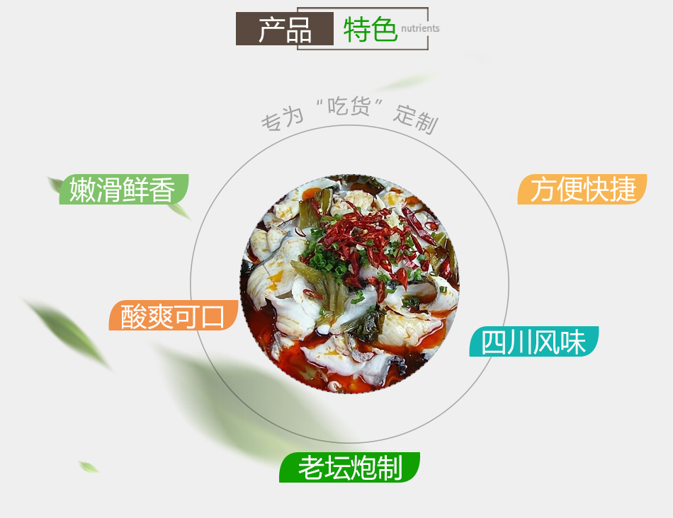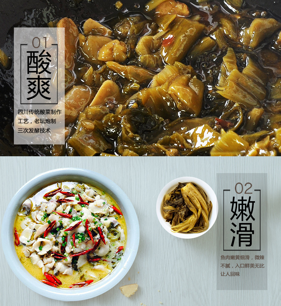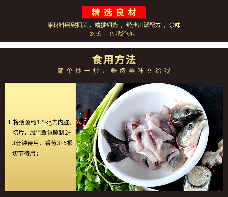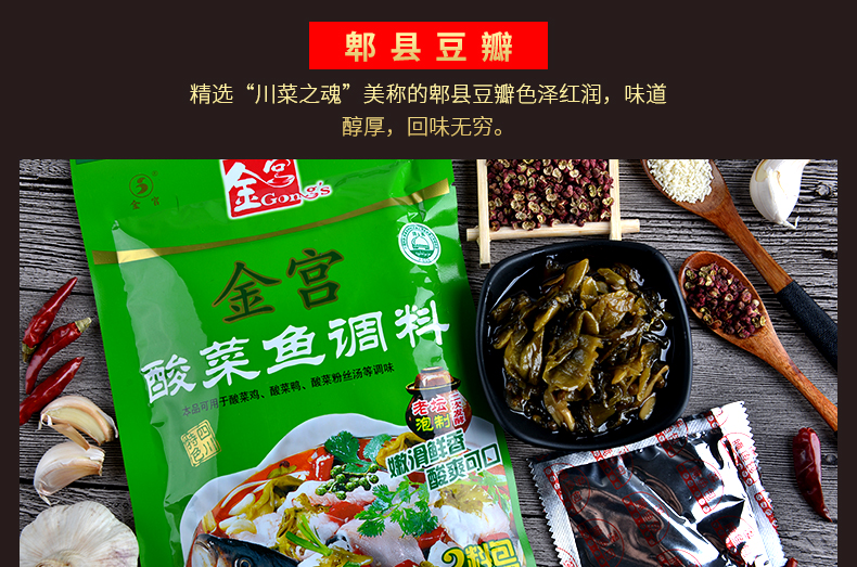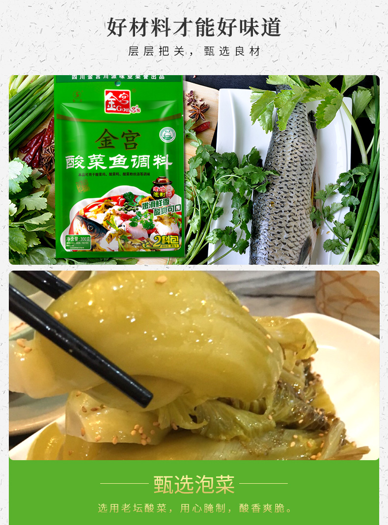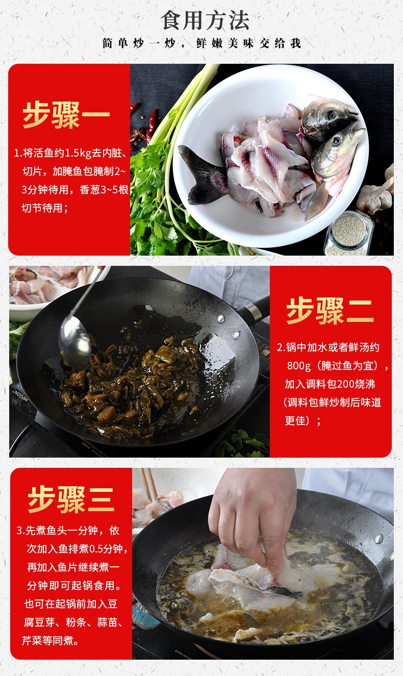 產(chǎn)品簡介:本產(chǎn)品憂選傳統(tǒng)老壇炮制的酸菜和小米辣,由金宮資深調(diào)味師精心調(diào)配,經(jīng)小火慢炒,讓酸、辣充分融合面獨樹一幟。食客在烹制過程中無需再次炒作,加適量清水下料煮魚至熟即成。